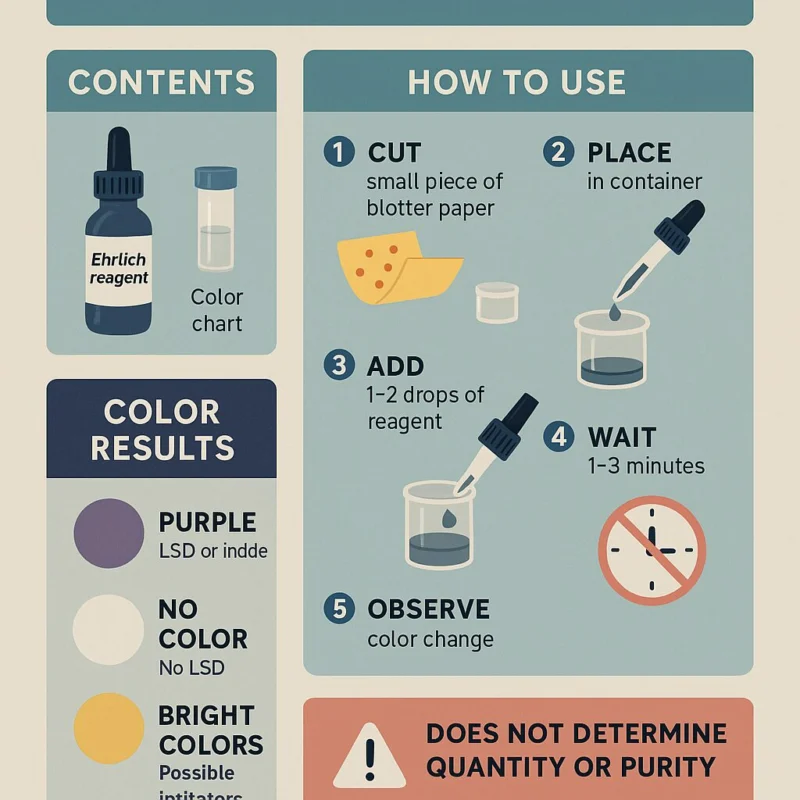 An LSD testing kit is a small chemical reagent kit that helps users verify the presence (or absence) of LSD in a substance. It’s designed to detect whether the tab or liquid you have contains actual LSD, or something potentially dangerous like 25I-NBOMe, DOx compounds, or other synthetic mimics.